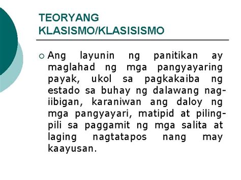 - Ang teoryang ito ay hindi palaging nakakapagbigay ng kasiyahan sa mga mambabasa dahil ito ay nagpapakita lamang ng realidad.